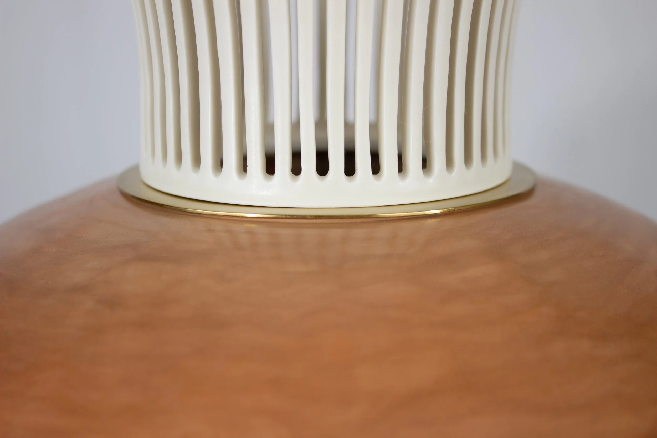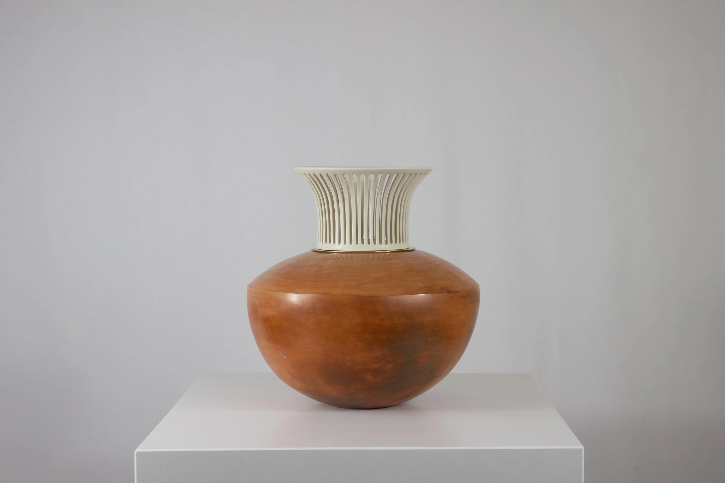 Porcelaine ajourée, grès jaune cuit au bois et laiton